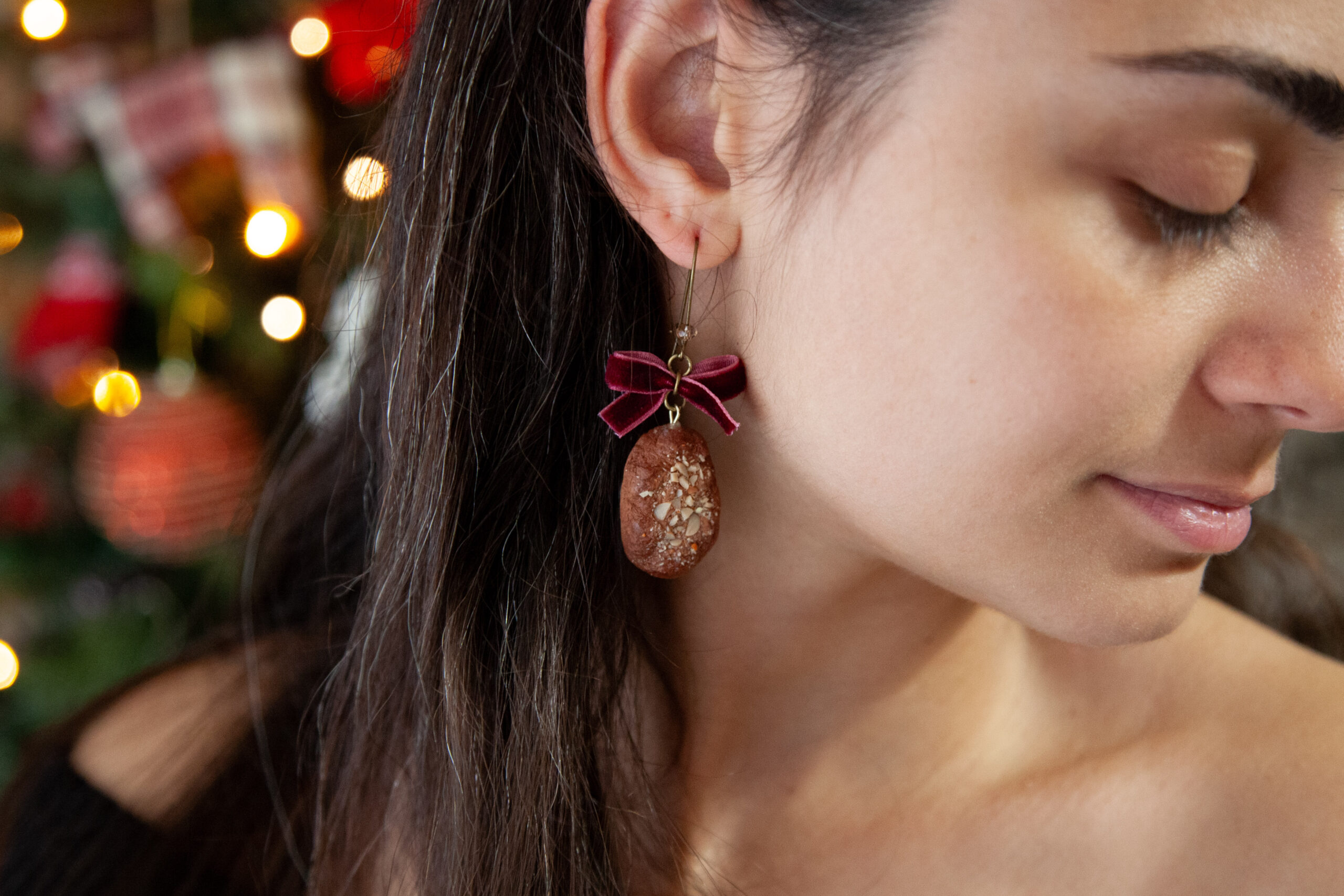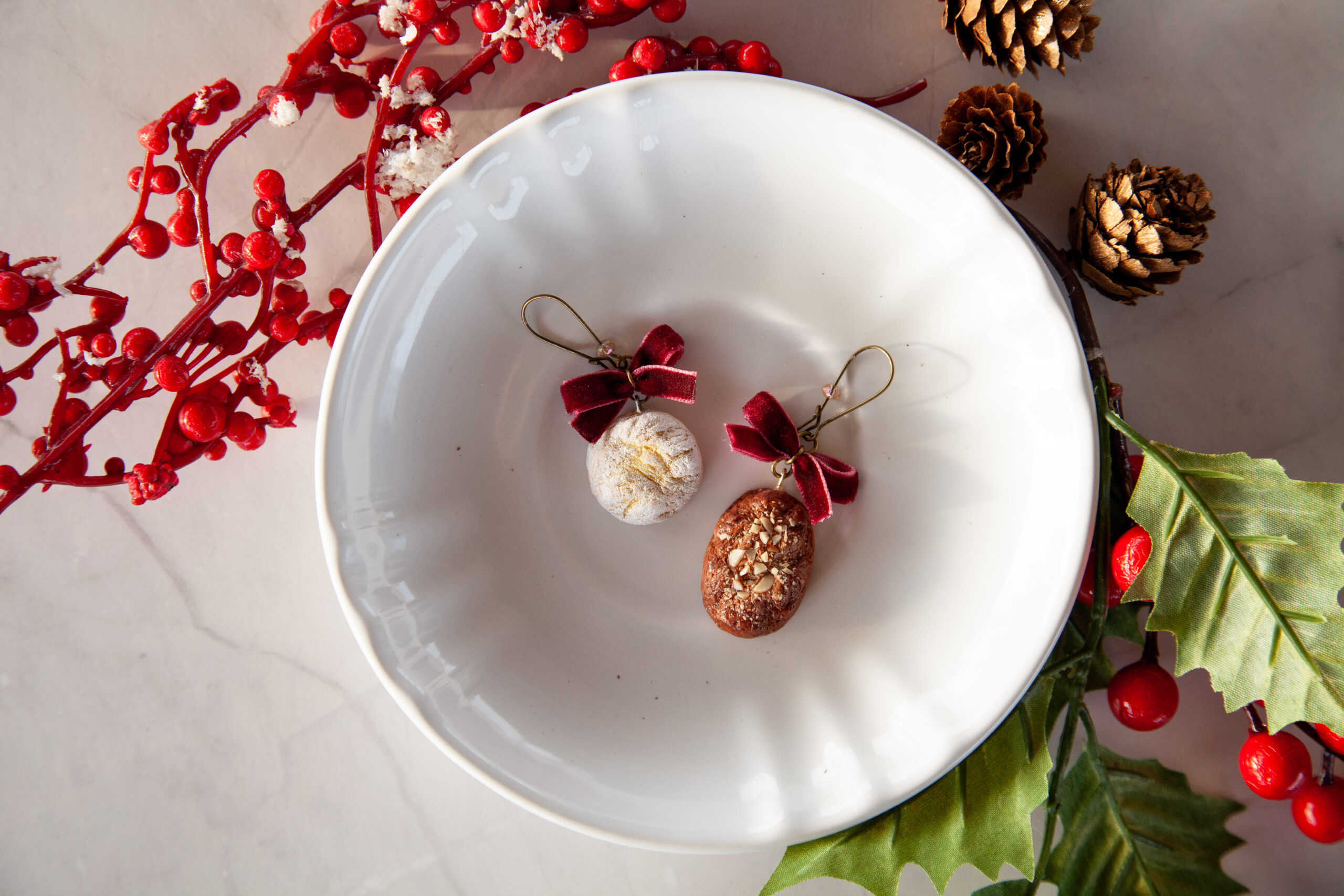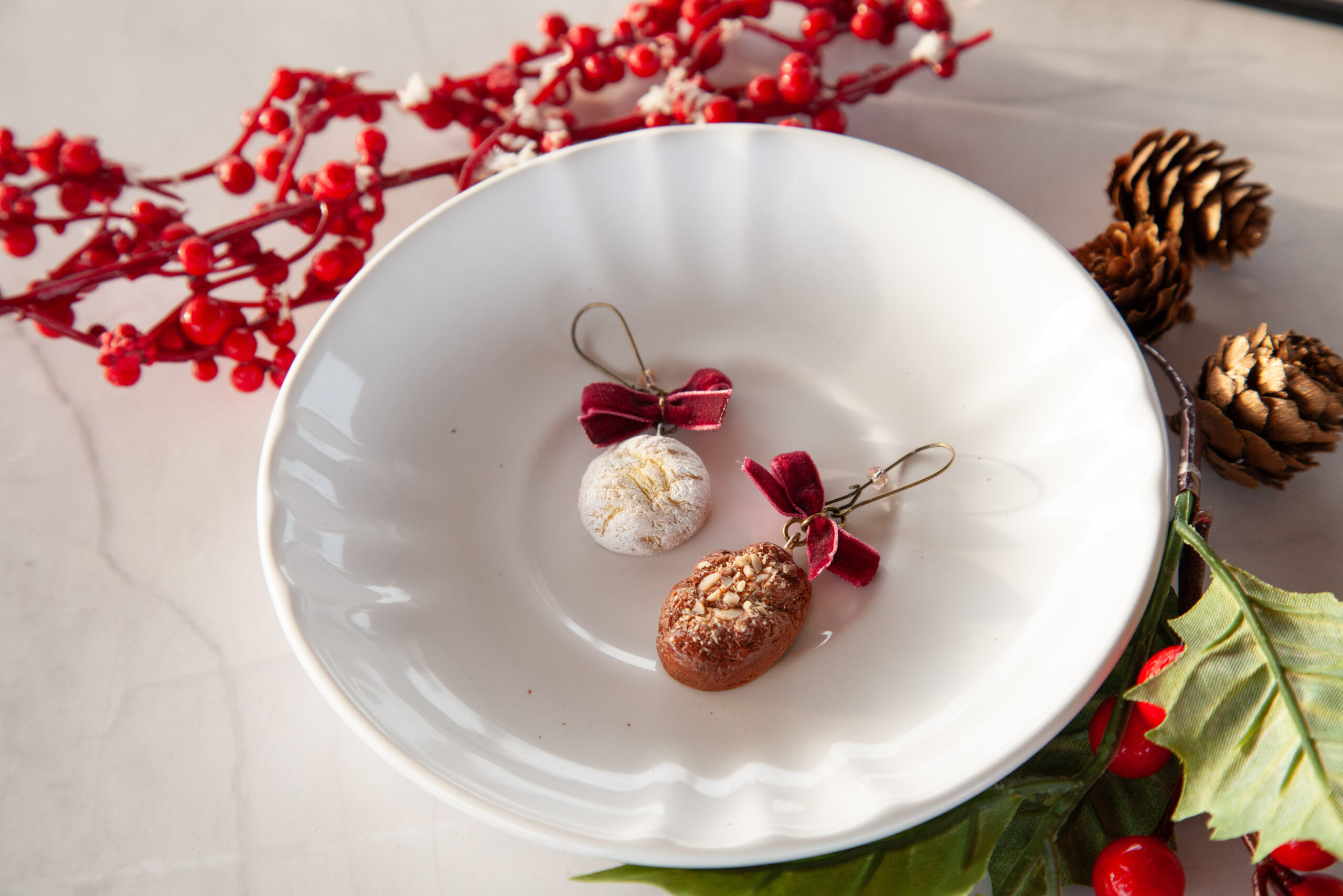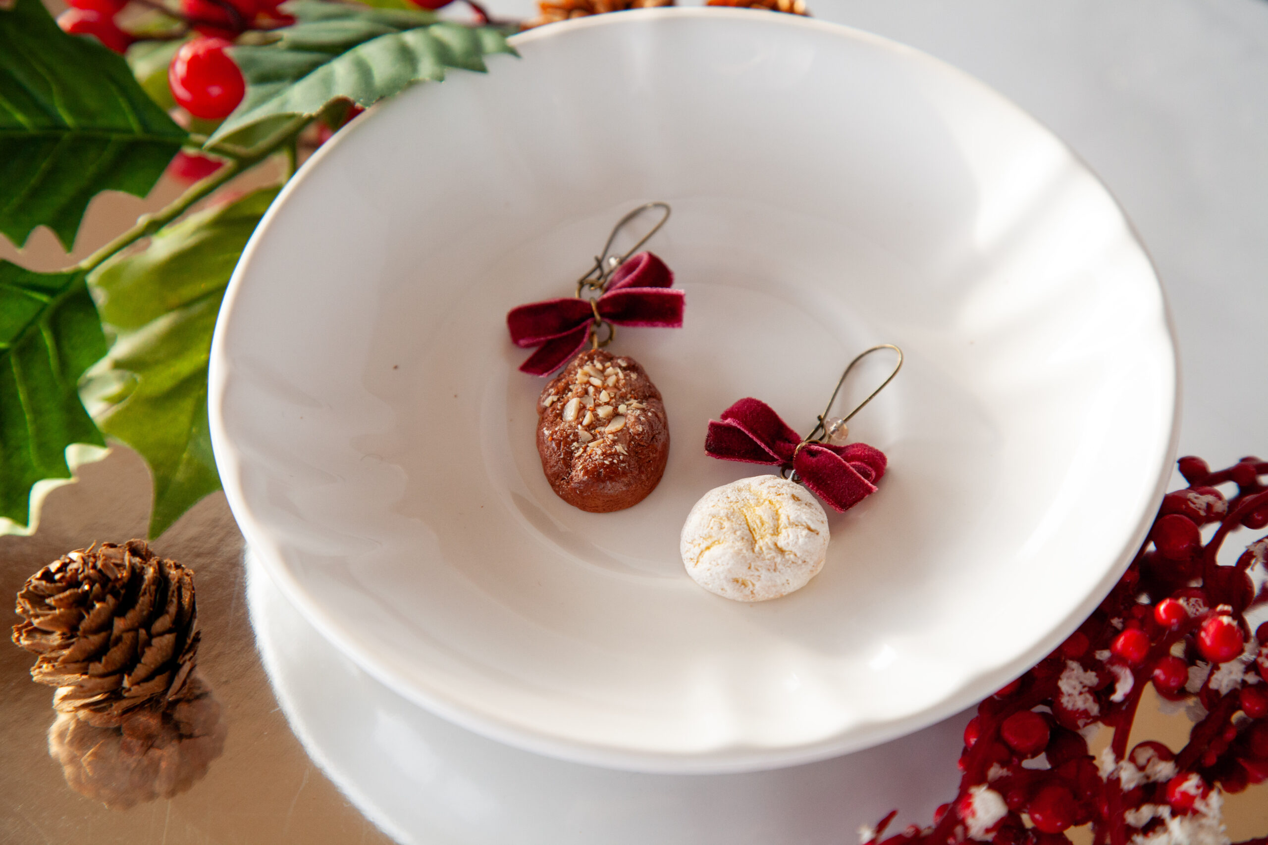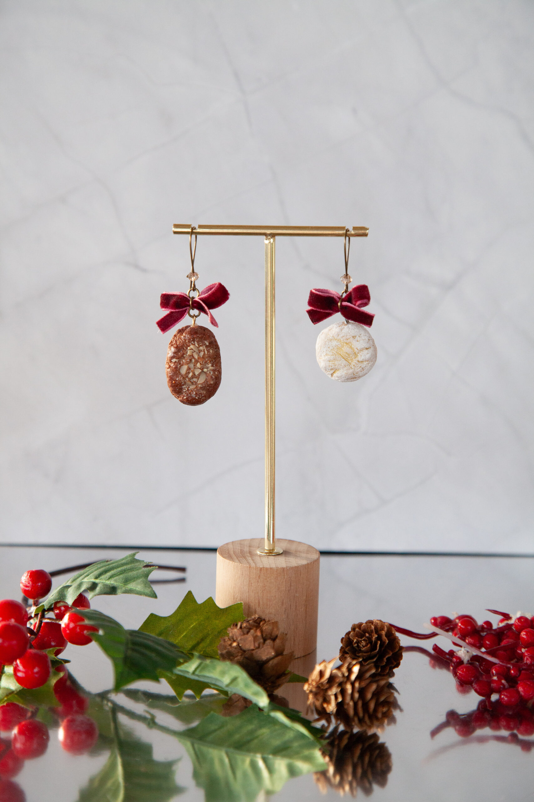 Αυτά τα λαχταριστά σκουλαρίκια Μελομακάρονο & Κουραμπιές είναι φτιαγμένα 100% από πολυμερικό πηλό και σμιλεμένα στο χέρι με απίστευτη λεπτομέρεια – από την υφή του μπισκότου μέχρι τα ψιλοκομμένα “καρύδια”. Κάθε ζευγάρι δημιουργείται με πολλή φροντίδα για να μοιάζει όσο πιο ρεαλιστικό γίνεται.