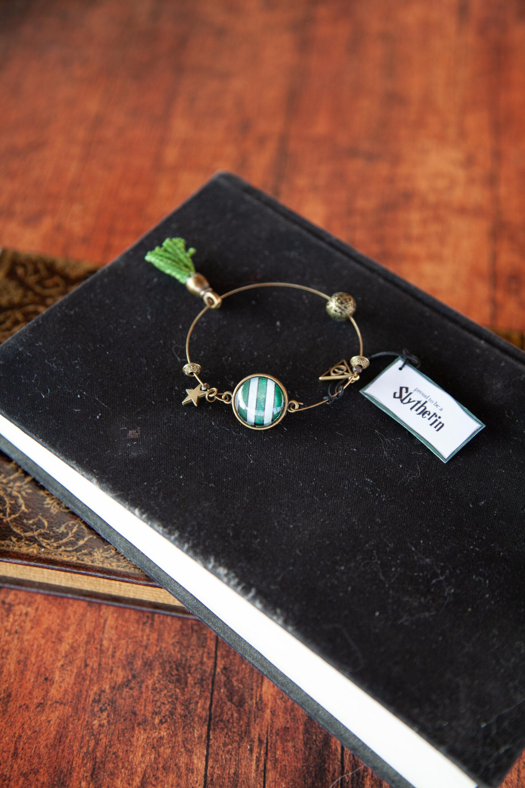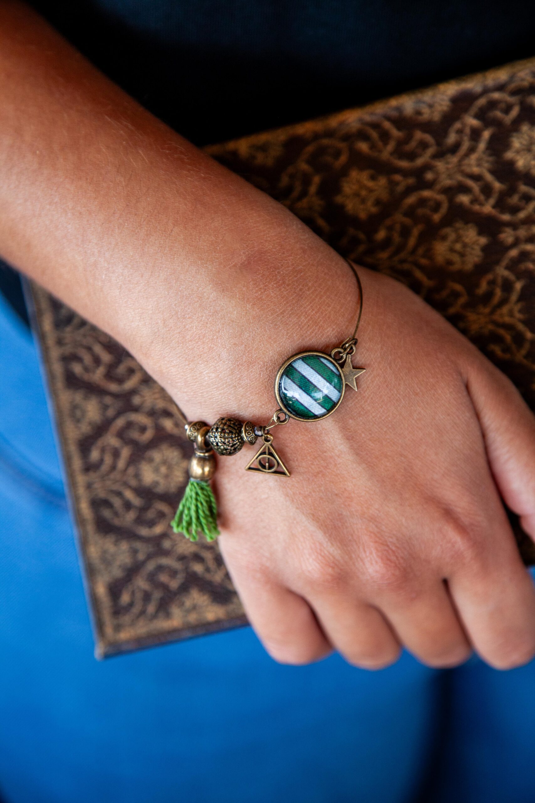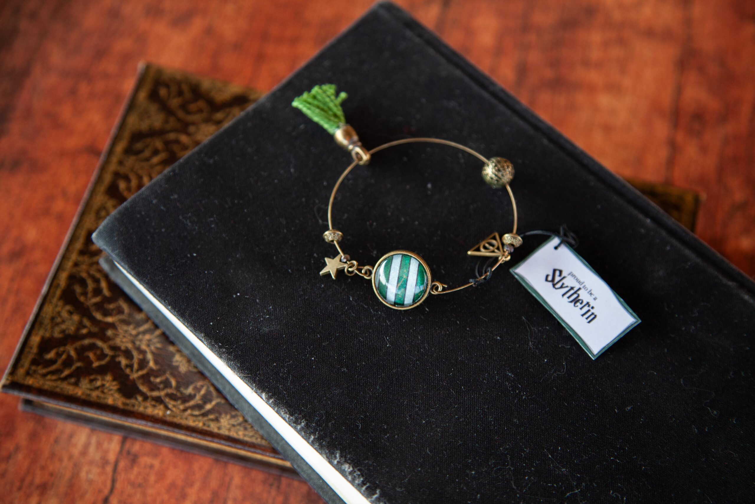 Αναδείξε την ευφυΐα και την αποφασιστικότητα του Slytherin με αυτό το μαγικό βραχιόλι. Χειροποίητο, μπρονζέ, με λεπτομέρειες σε πράσινο και ασημένιο χρώμα που αντιπροσωπεύουν τον οίκο. Η φουντίτσα, οι μπρονζέ χάντρες και το στοιχείο με τους Κλήρους του Θανάτου κάνουν το βραχιόλι μοναδικό και ταυτόχρονα διακριτικά εντυπωσιακό.