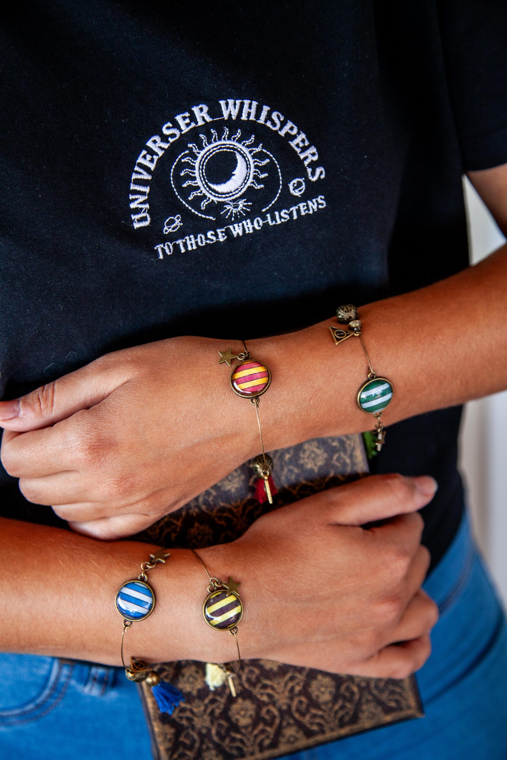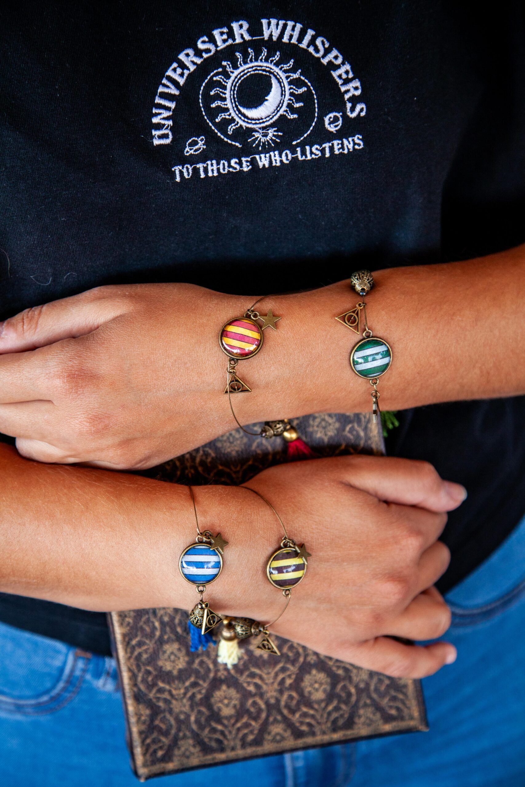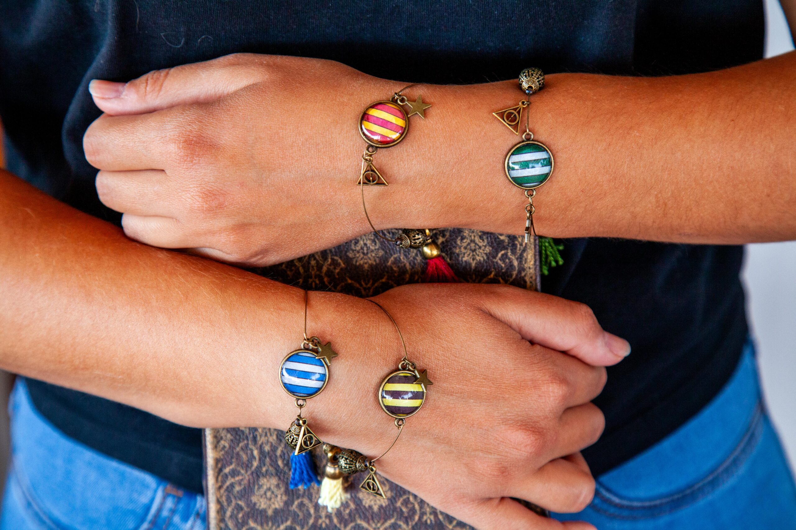 Αναδείξε την ευφυΐα και την αποφασιστικότητα του Slytherin με αυτό το μαγικό βραχιόλι. Χειροποίητο, μπρονζέ, με λεπτομέρειες σε πράσινο και ασημένιο χρώμα που αντιπροσωπεύουν τον οίκο. Η φουντίτσα, οι μπρονζέ χάντρες και το στοιχείο με τους Κλήρους του Θανάτου κάνουν το βραχιόλι μοναδικό και ταυτόχρονα διακριτικά εντυπωσιακό.